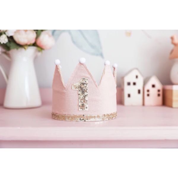A 1st birthday pink linen and gold adjustable crown for your precious little one to celebrate. Features bright gold sequins and felt with linen backing.