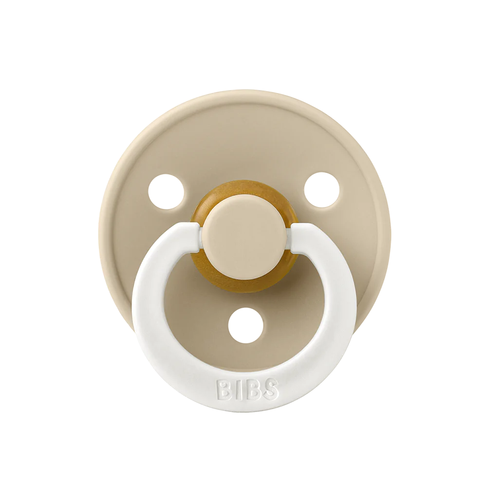 The Colour pacifier is the original BIBS pacifier and has been on the market for over 40 years. It has the signature round BIBS shield with three vent holes and round BIBS engraved handle ring.