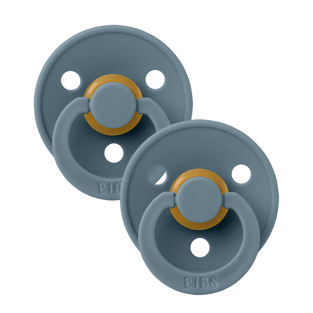 The Colour pacifier is the original BIBS pacifier and has been on the market for over 40 years. It has the signature round BIBS shield with three vent holes and round BIBS engraved handle ring.