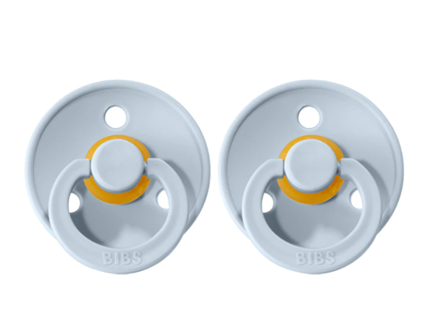 The Colour pacifier is the original BIBS pacifier and has been on the market for over 40 years. It has the signature round BIBS shield with three vent holes and round BIBS engraved handle ring.