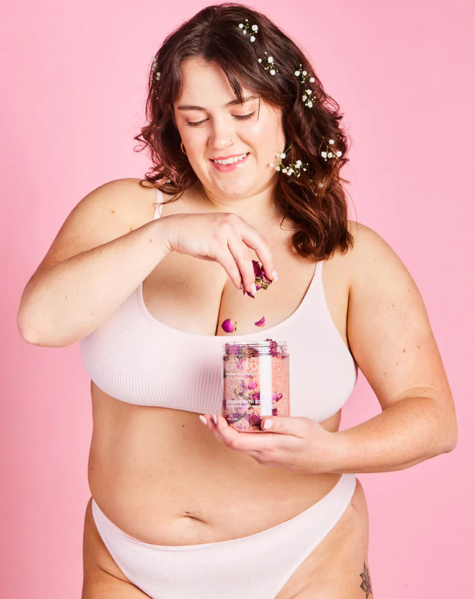 A natural fusion of soothing lavender, clementine, rosehip and sugandha kokila essential oils to ease the mind and replenish the skin. Infused with organic dried rose petals and epsom salts for the ultimate sensual bathing experience. Romance yourself.