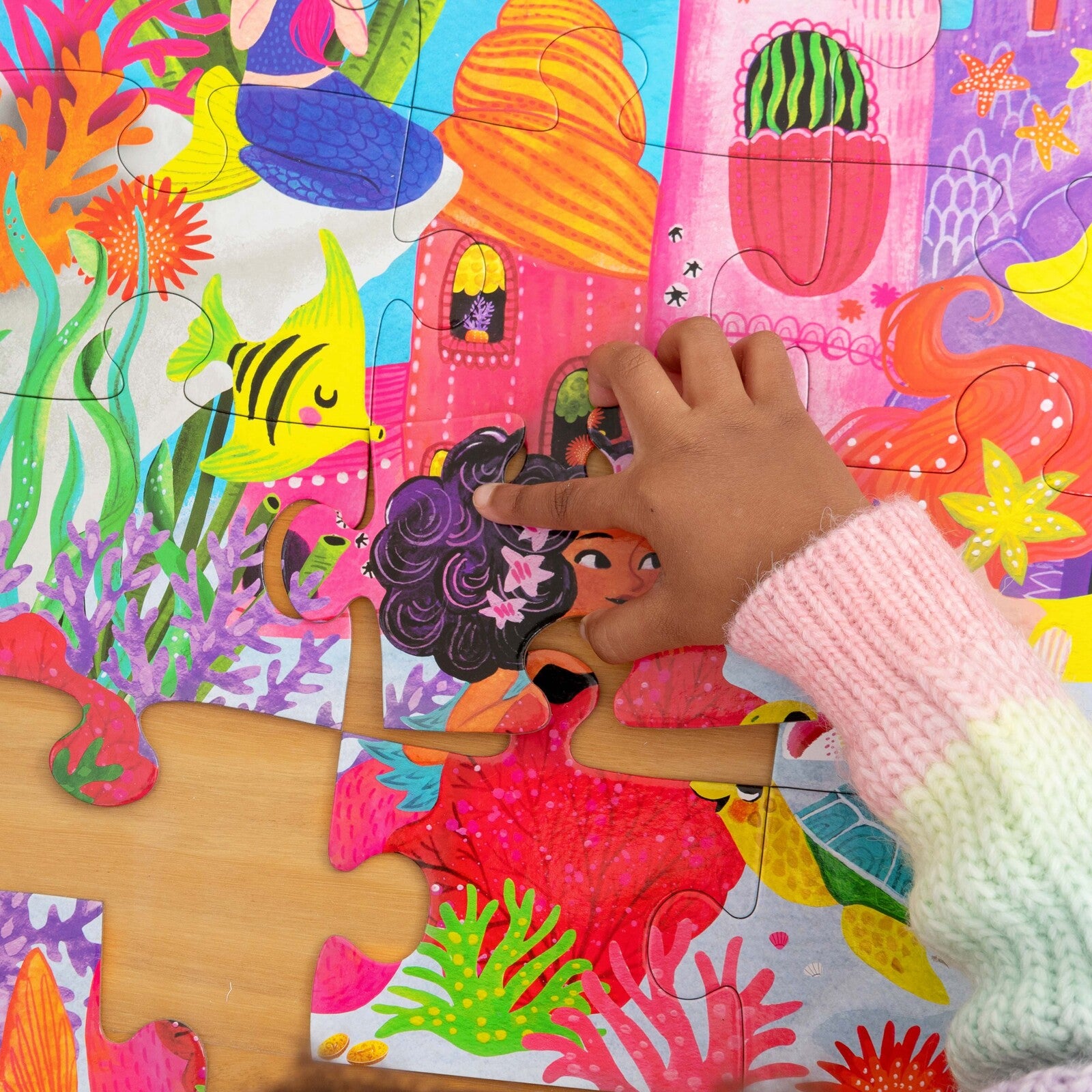 An intricately illustrated ocean floor rich with mermaids, dolphins and treasure chests awaits in this beautiful 36-piece floor puzzle. All wrapped up in its unique contour-shaped storage box, the jumbo, sturdy pieces of this high-quality puzzle are ideal for little hands.