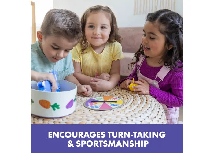 - Includes colorful game board conveniently located in the game box, 1 Hoppy Floppy Squeezer, 16 carrots, 4 baskets, game spinner, and guide