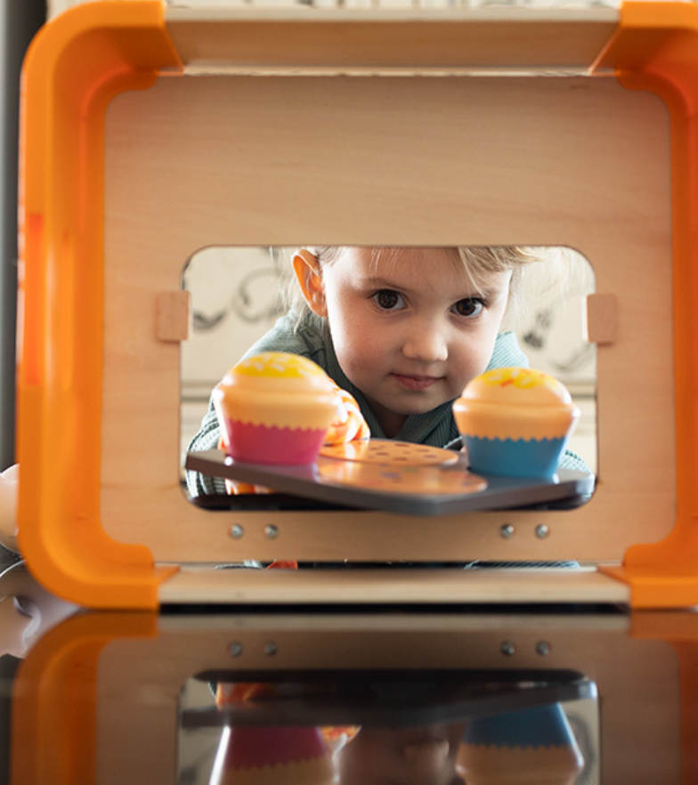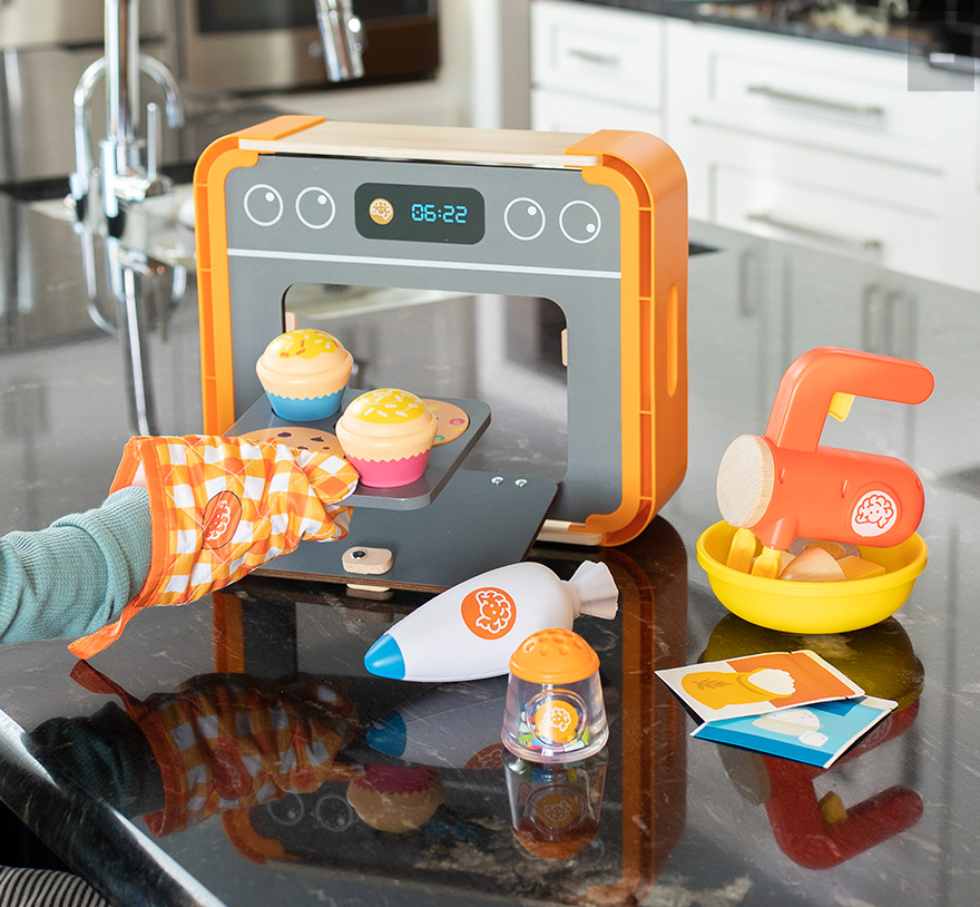 Pretend baking toys with storage crate that doubles as oven