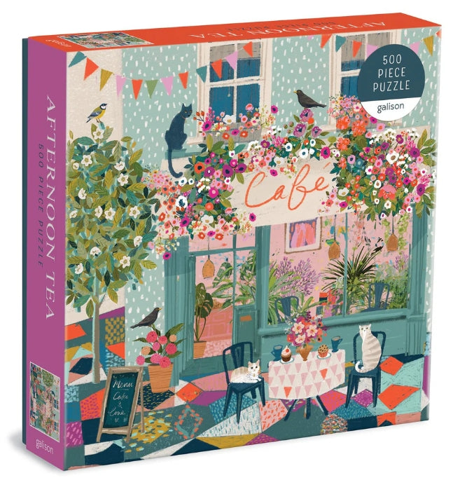 The Afternoon Tea 500 Piece Puzzle features a charming illustration by bestselling artist Victoria Ball of a street cafe decorated by blooming flowers, adorable cats, and birds. Galison puzzles are packaged in matte-finish sturdy boxes, perfect for gifting, reuse, and storage. An insert of the full puzzle image is also included.