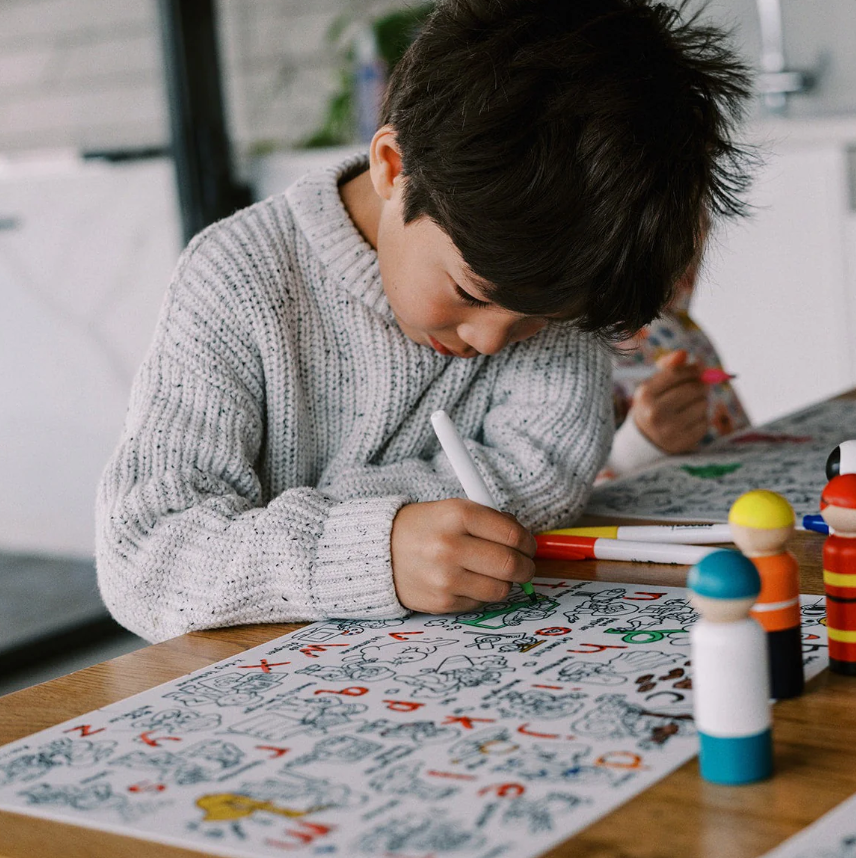 Each mat is thoughtfully designed and features an educational theme (ie space, letters, farm animals, numbers) so your curious kids can learn as they trace, draw and colour!