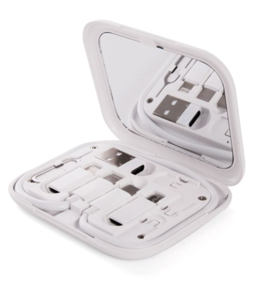Set of 5 cable adaptors in a handy case which includes a compact mirror in the lid and doubles as a phone stand.
