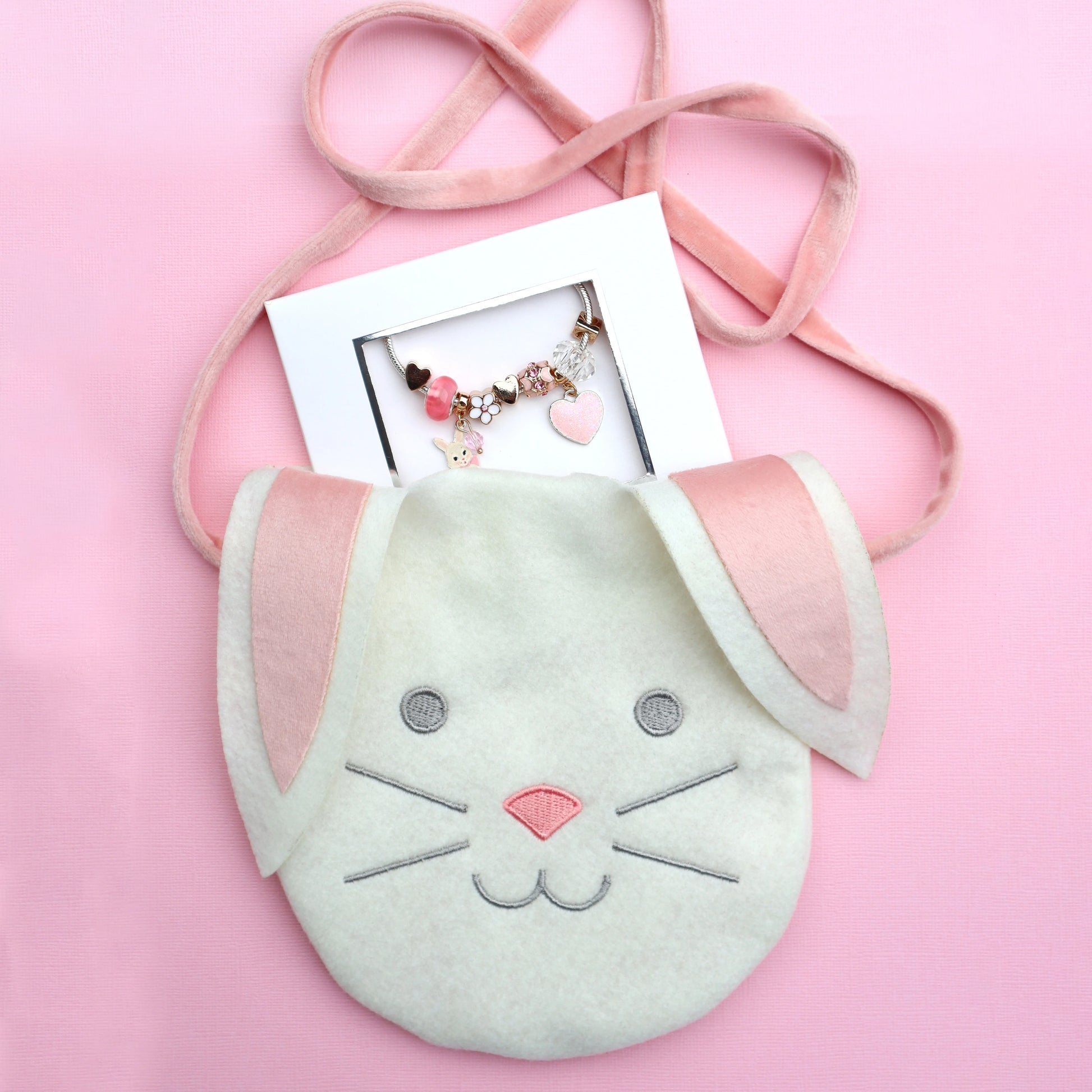 Every little bunny needs their own bag, and the Mia the Bunny Bag will become a treasured possession of the little bunny who owns it. This delightful bag bears the face of a cute, whiskered bunny with a sweet pink nose, and two flopping bunny ears. Made of beautiful, soft felt with a luxurious pink velvet strap to wear over their shoulder, you can hide another little gift inside when you give this to your little one.