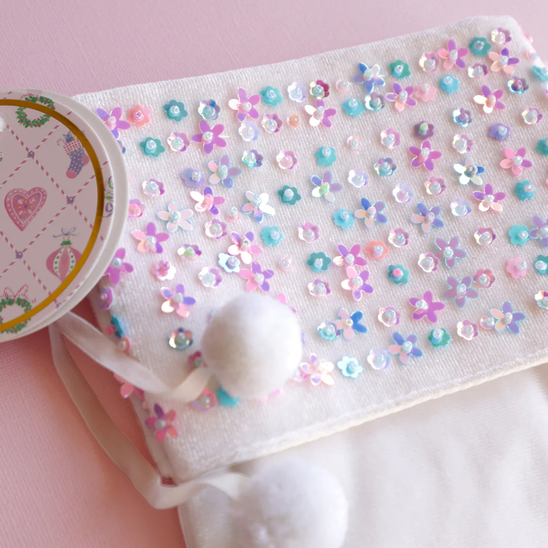 Begin a new tradition for your little one with their very own special stocking with a design that is just for them. Featuring adorable little pom poms and covered in shining pastel flower sequins, each sequin is embellished with its own bead - an additional level of detail to make this stocking a beautiful memory they will always keep.