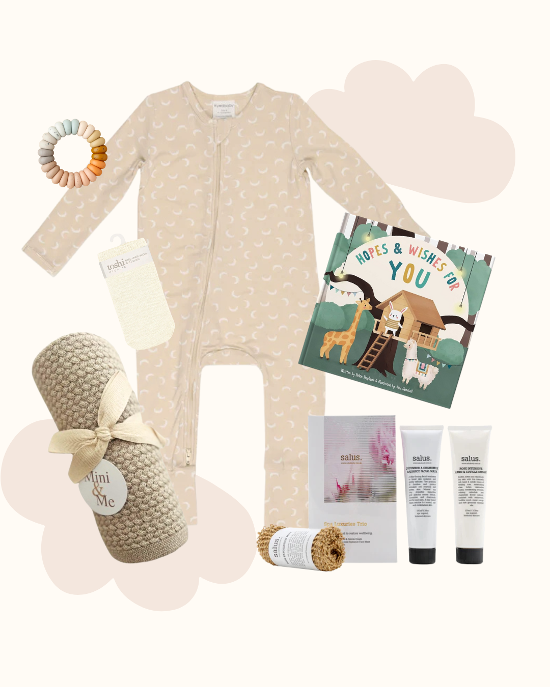 Each hamper comes in a beautiful reusable white magnetic closure box, perfect for storage or for parents to keep sentimental items in. If you would like the hamper gift wrapped, please select this option at checkout!
