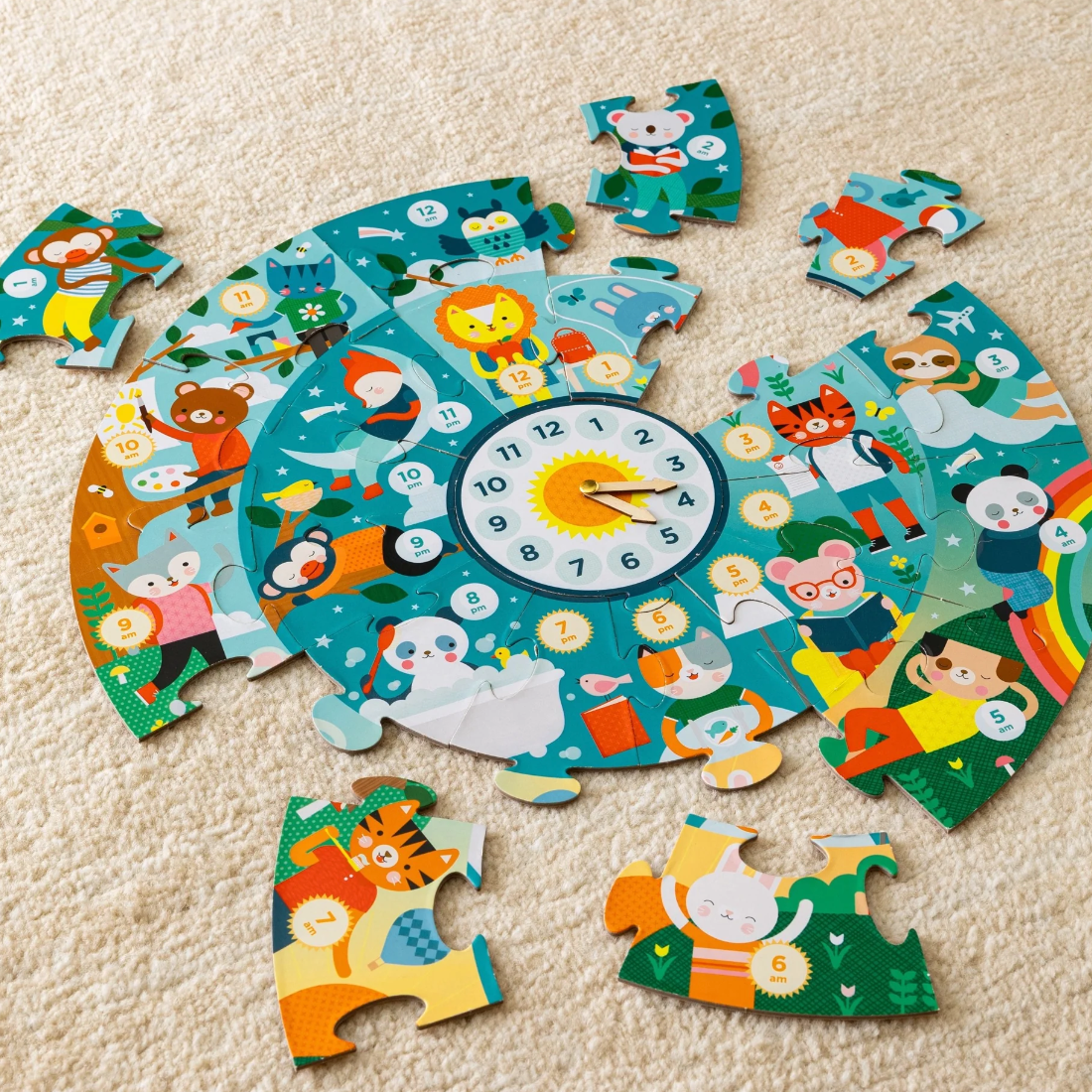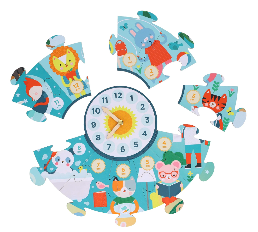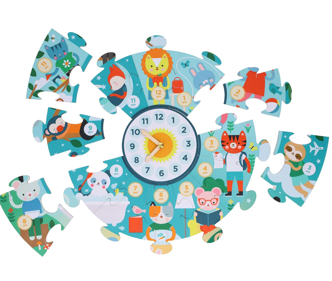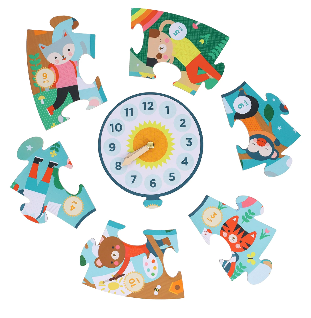 Learning to tell the time has never been so much fun! Can you find the bear painting at 10am? The sleeping sloth at 3am? The tiger brushing his teeth before the day begins? Fill in the hours of the day and night with the animals having fun playing, eating, and sleeping. Once the puzzle is complete, use the moving hands to set different times and have fun thinking about what routines or activities you do at these times each day.