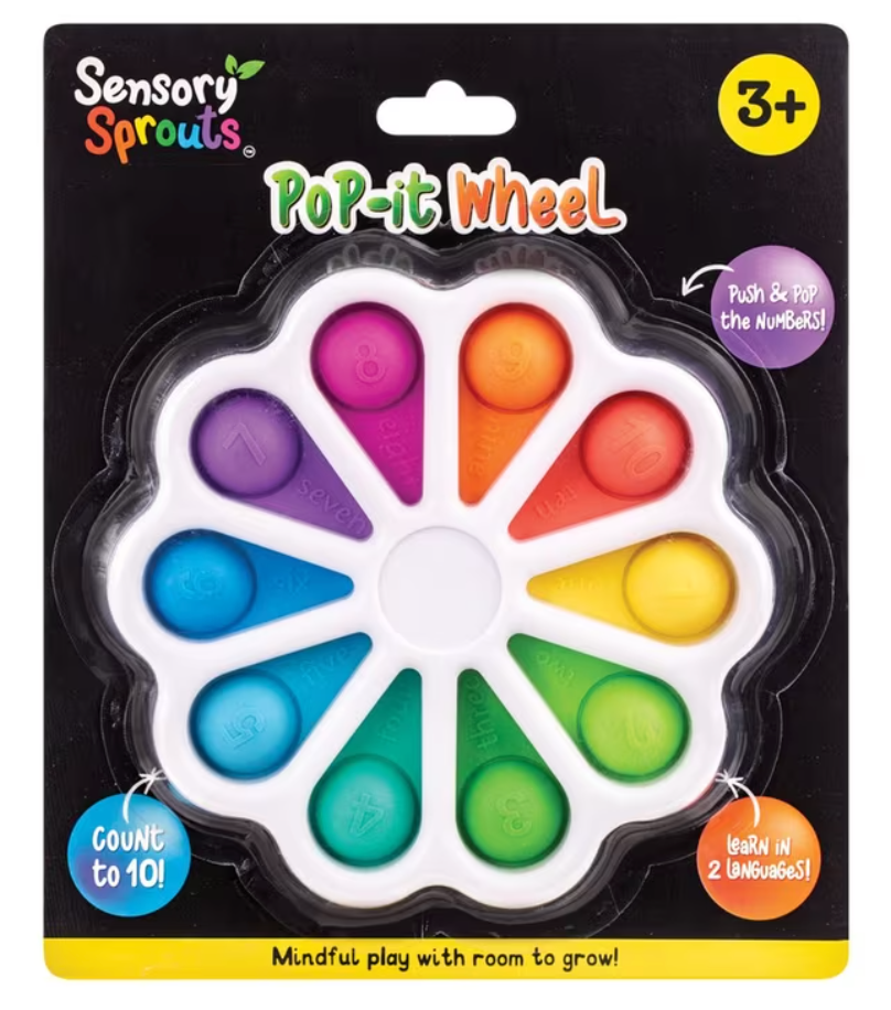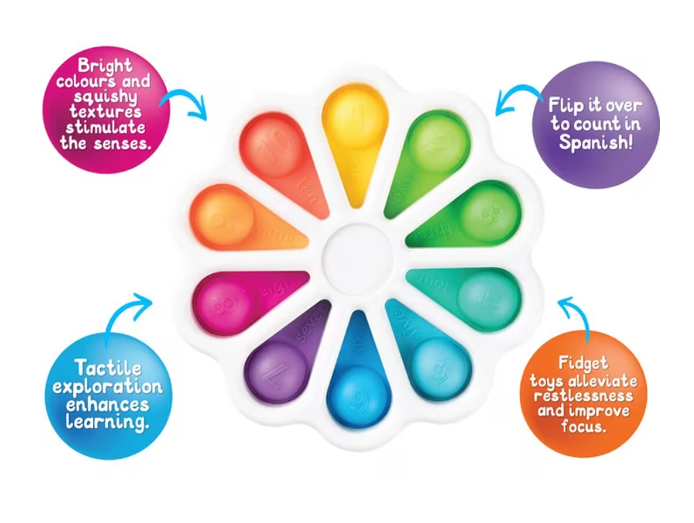 This Sensory Sprouts Pop-It Wheel is a colourful, flower shaped fidget toy that features popping bubbles with English numbers on one side and Spanish on the other. It's great for making learning bilingual numbers interactive and exciting. Plus, it's perfect for little fingers to press, pop and count and is a fantastic tool for early learning, sensory exploration and stress relief.