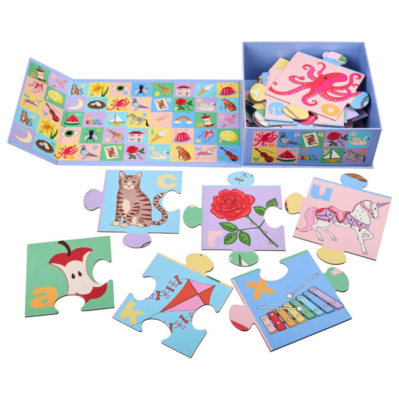 Discover the alphabet with Wonderscope's Alphabet Floor Puzzle, featuring the vibrant illustrations of Karen Mabon. It features 28 large pieces, which each correspond to a different letter of the alphabet, joining to create a magical super-sized puzzle!